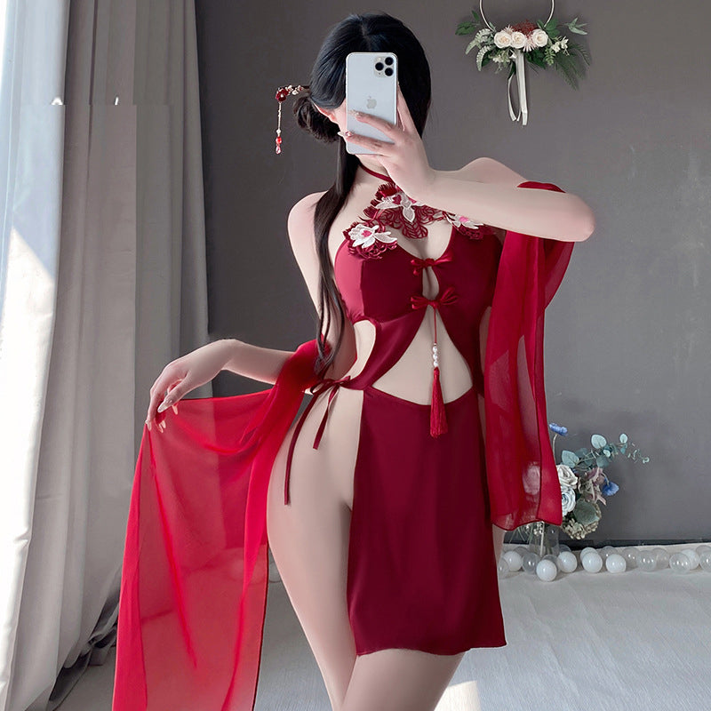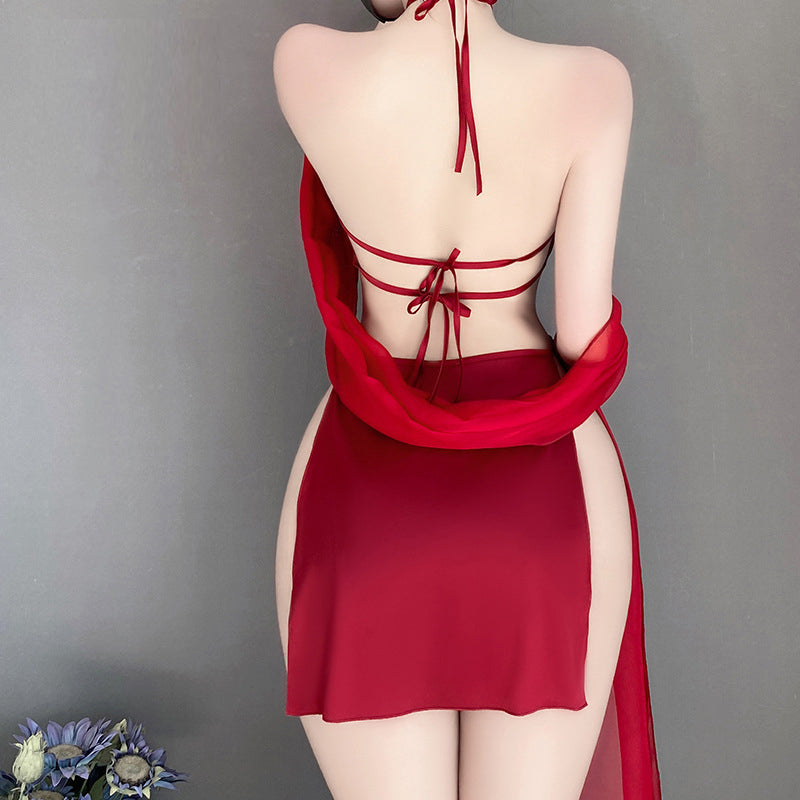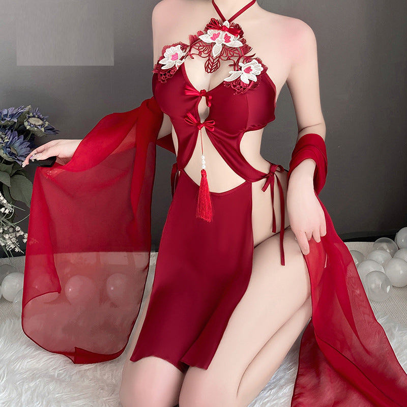 Chinese ancient style hanging neck lace-up sexy underwear embroidery pure desire hollow backless women's uniform suit