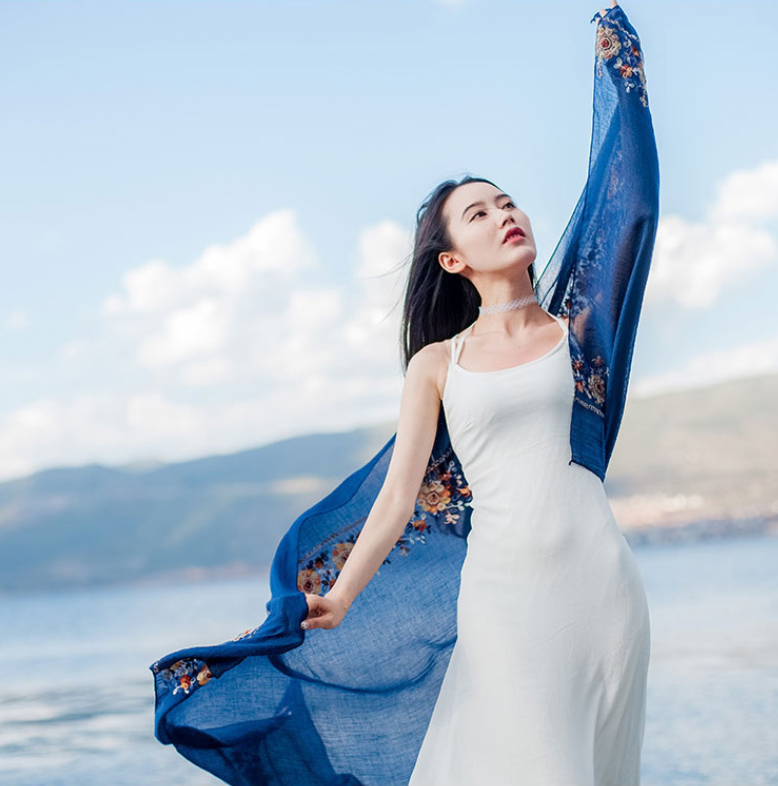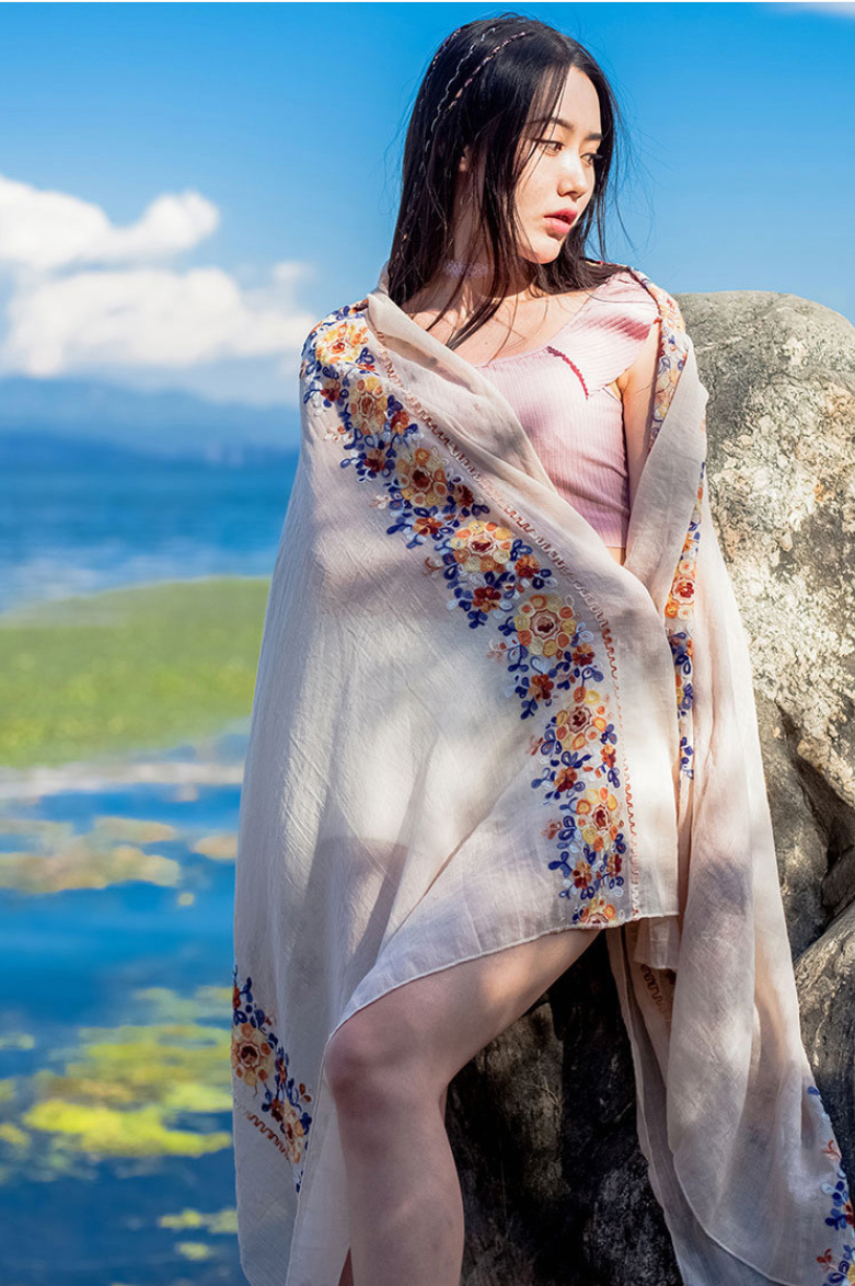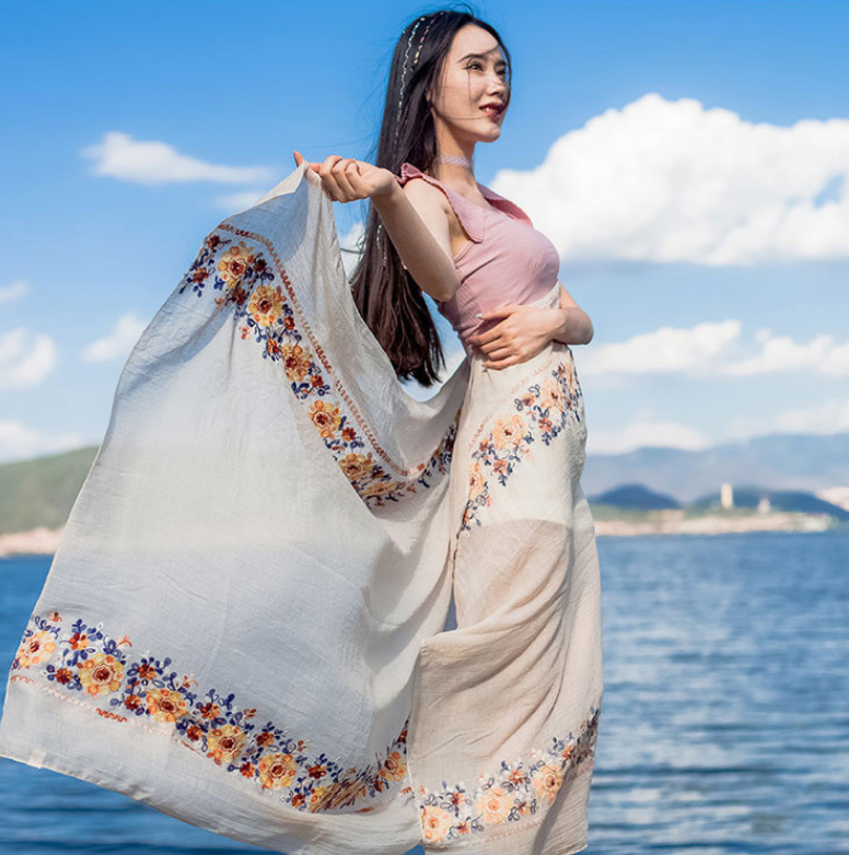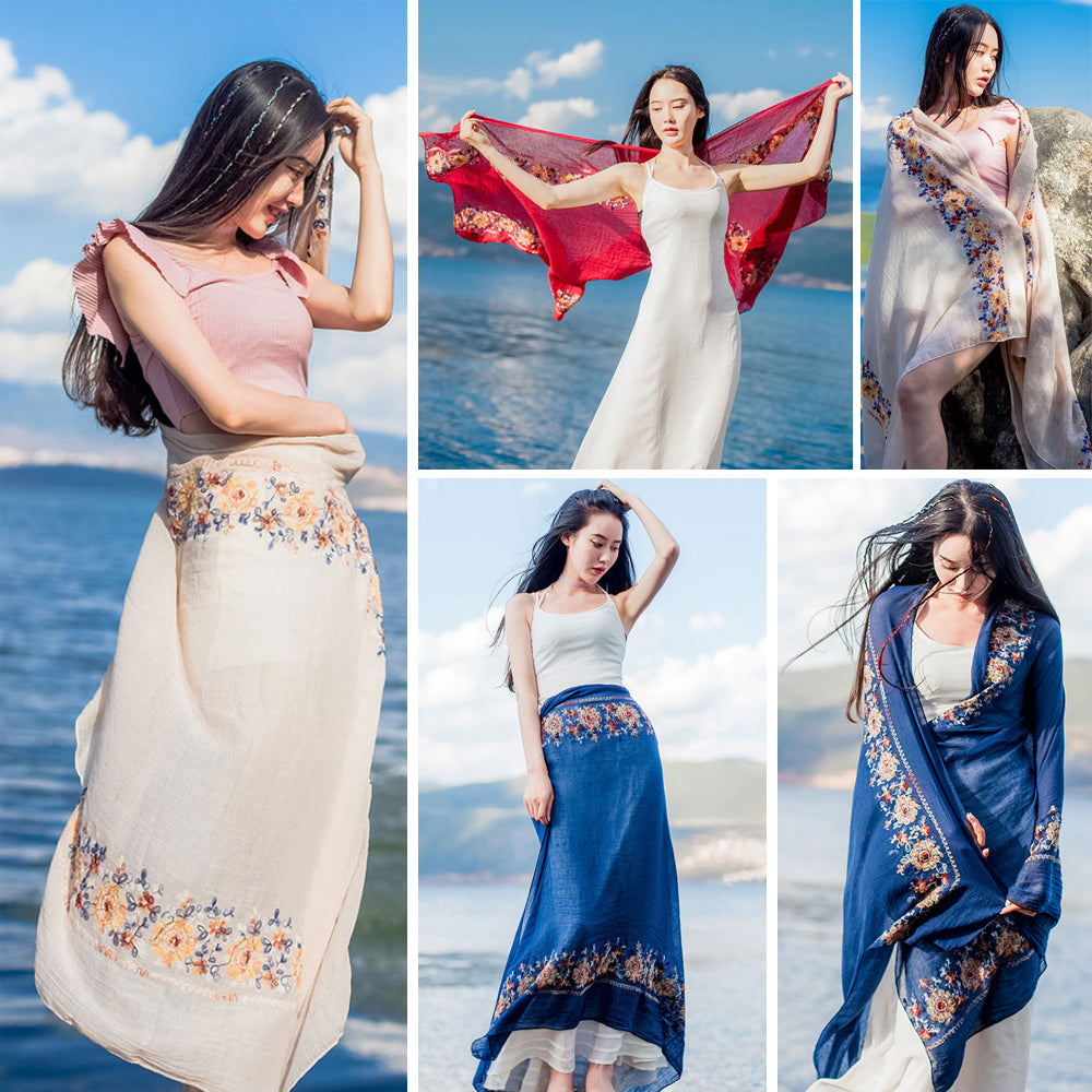 Flower embroidery Women Beach Scarf Cotton Linen Shawls and Wraps
