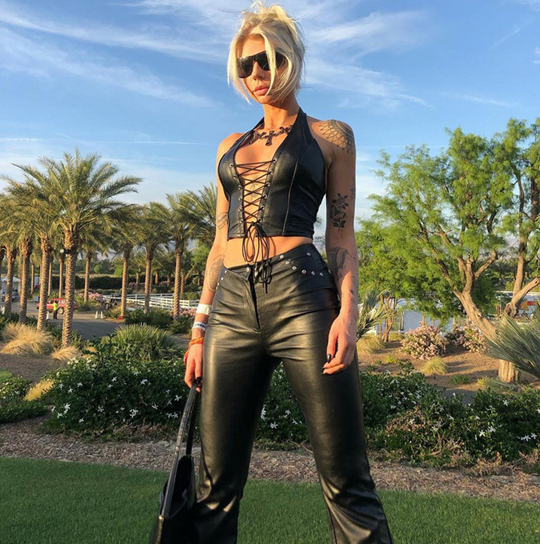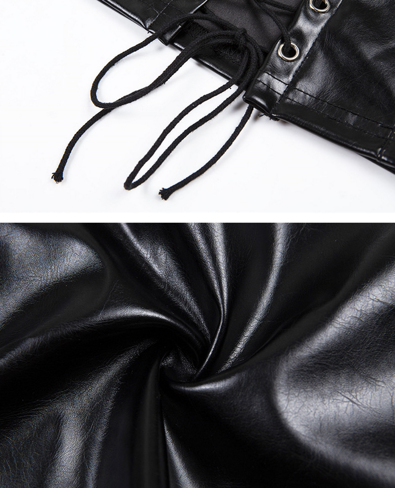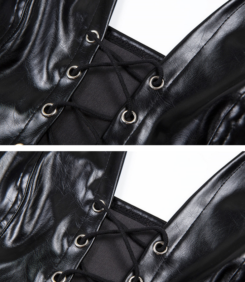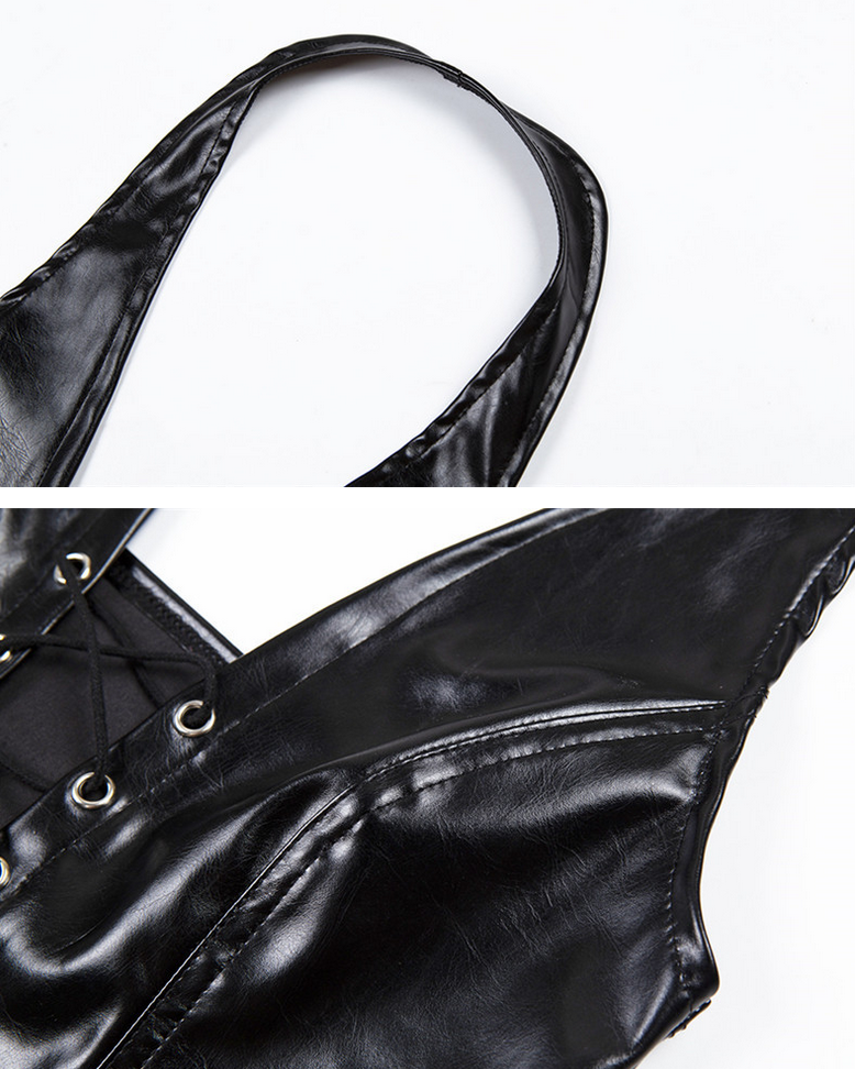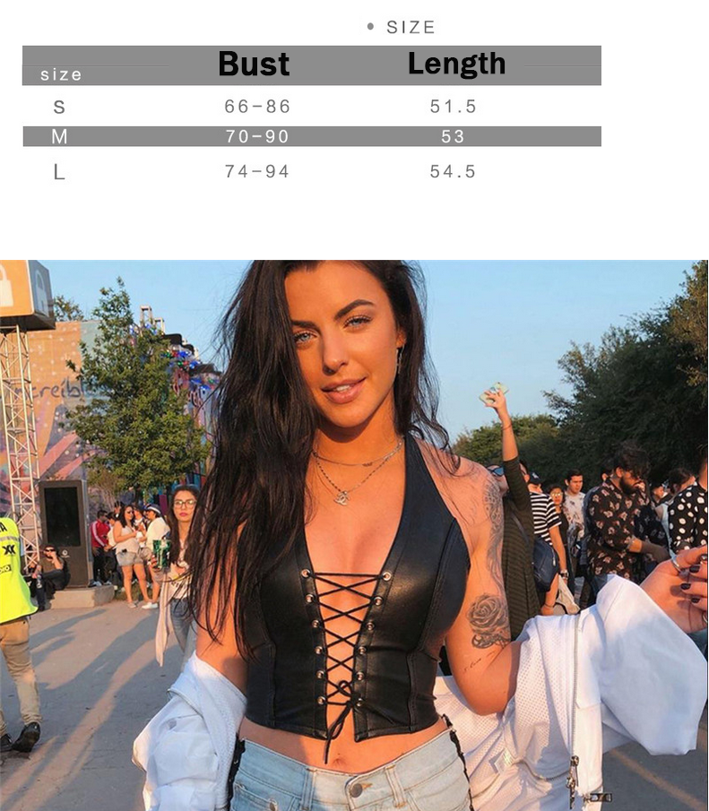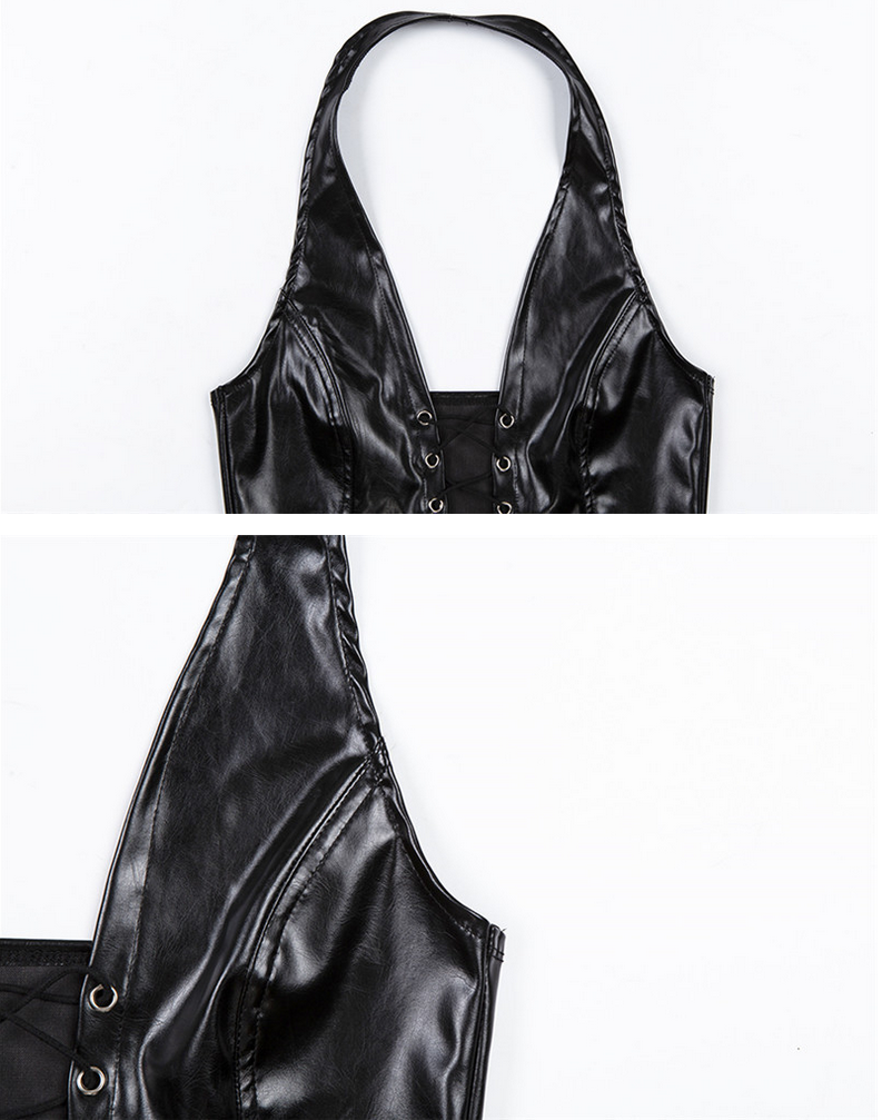Sexy Lace Up Front Backless PU Leather Black Halter Top Party Clubwear Biker