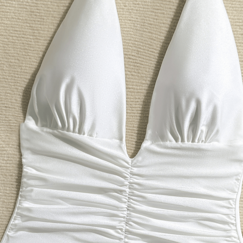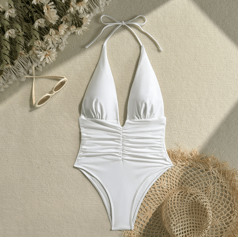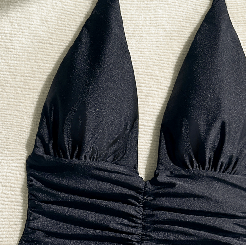 Solid color, halterneck design, deep v collar, high waist, which makes you more charming and sexy on the beach.