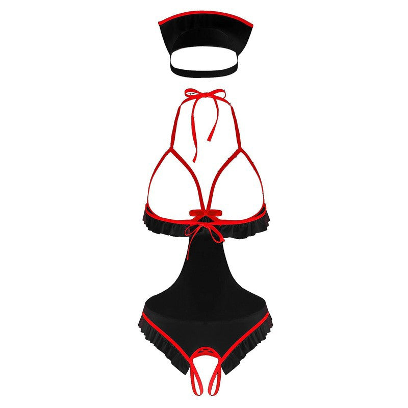 Halter neck, open cups and front cut out design with ruffles below bust, backless with straps tie at back, crotchless and ruffled leg openings.
