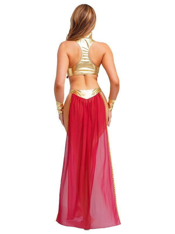 The crop top with removable collar and sleeves adds a touch of elegance and sophistication, enhancing the overall regal appearance.